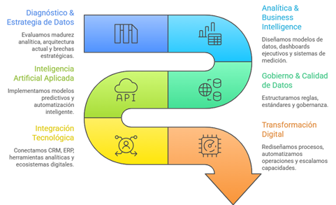 Diseñamos una ruta clara: diagnóstico, arquitectura y gobierno de datos, BI, IA aplicada e integración tecnológica.